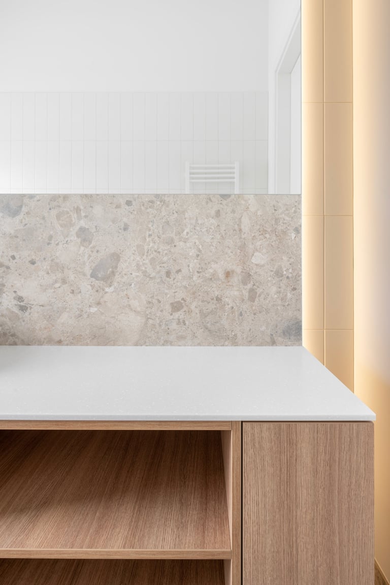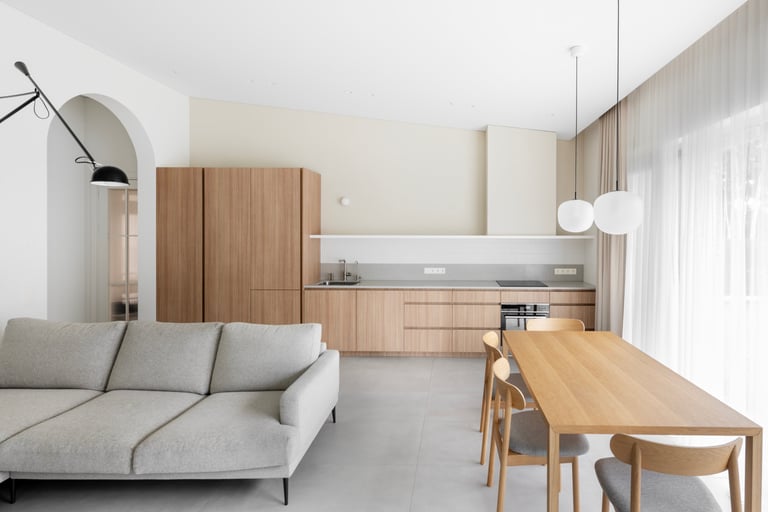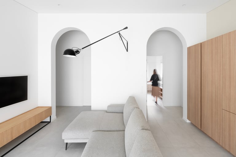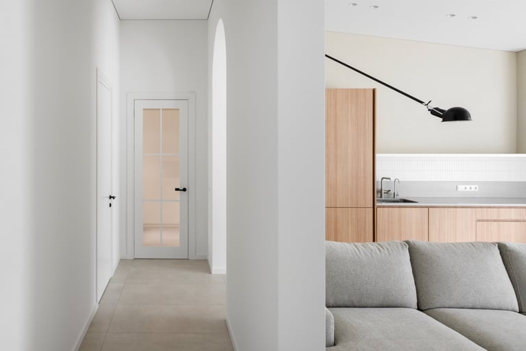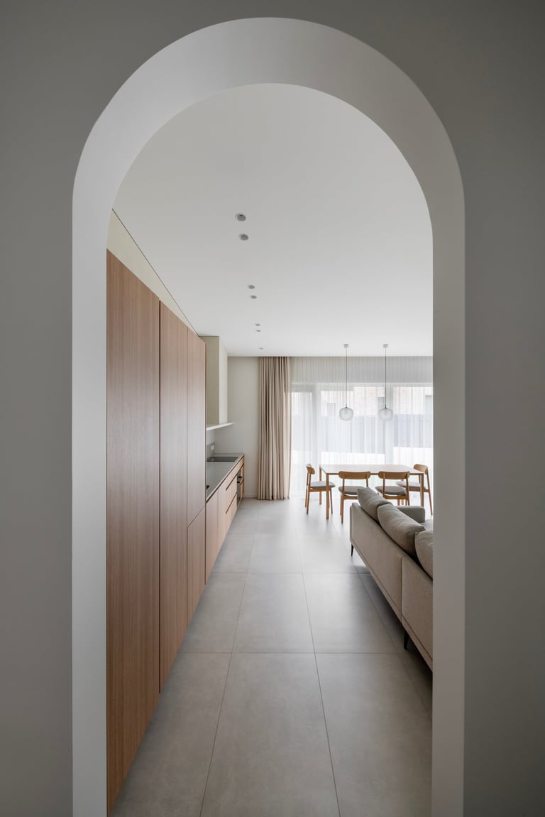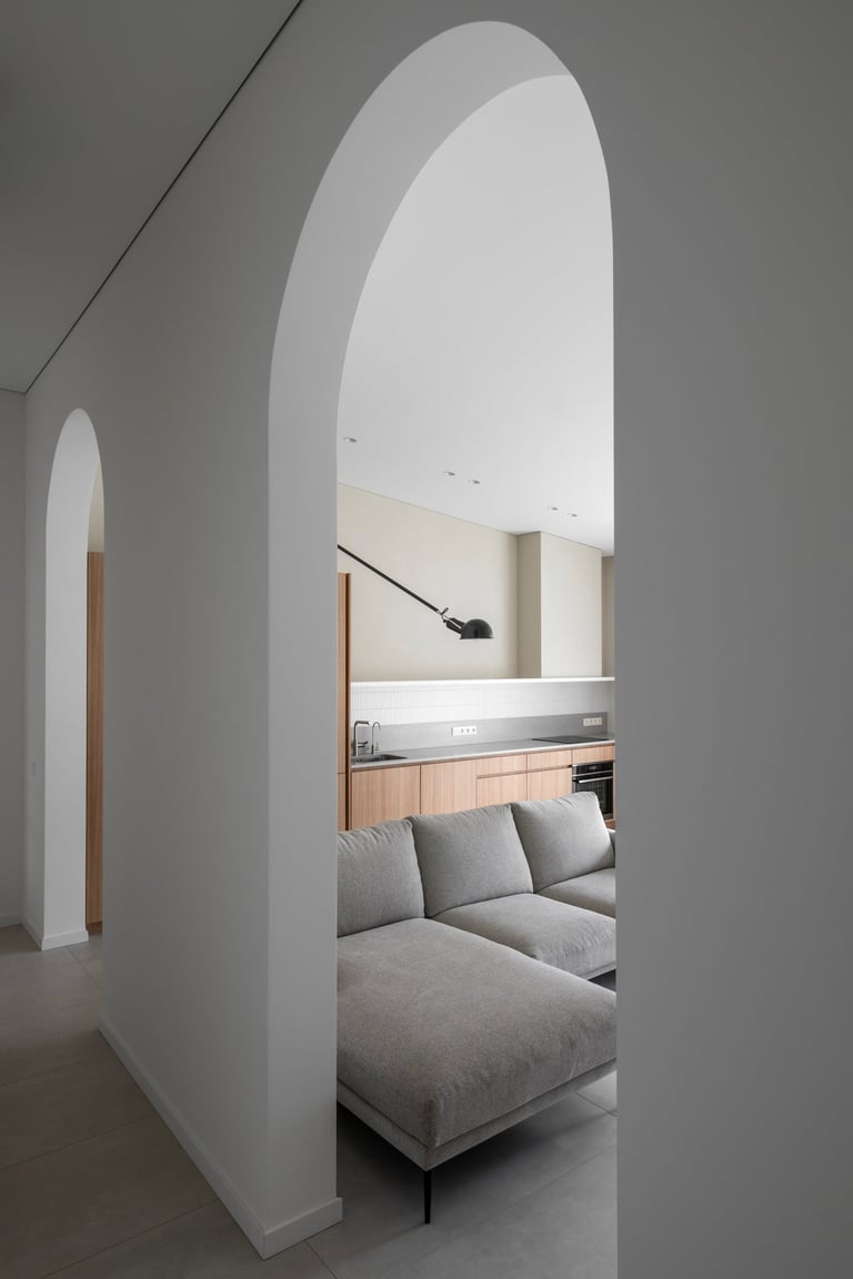 Namai, kuriuose minimalistinę visumą kuriančios formos ir natūralūs atspalviai susilieja į ramią kasdienybę. Medžio ir akmens tekstūros sušildo šviesią pastelinę aplinkos paletę. Išraiškingas architektūrinis akcentas – dvi arkos, formuojančios subtilius perėjimus tarp svetainės ir virtuvės zonų. Interjeras alsuoja skandinavišku lengvumu ir vientisumu.