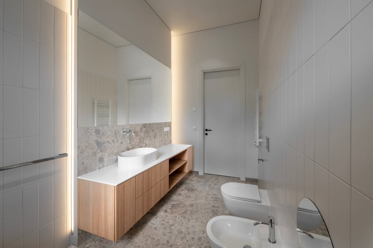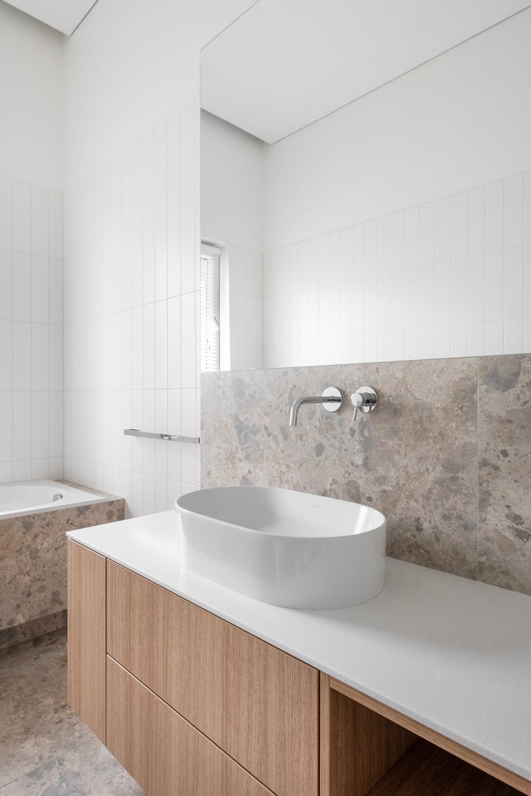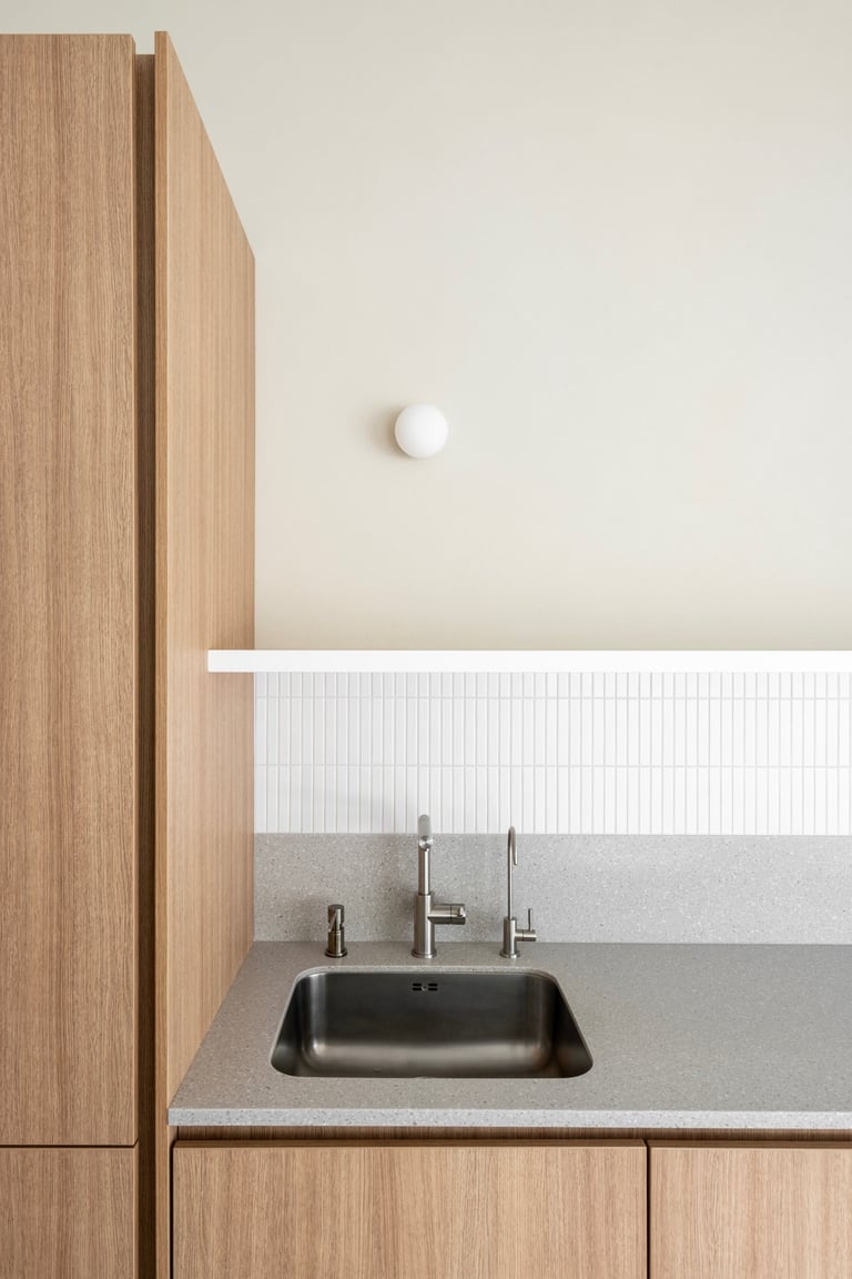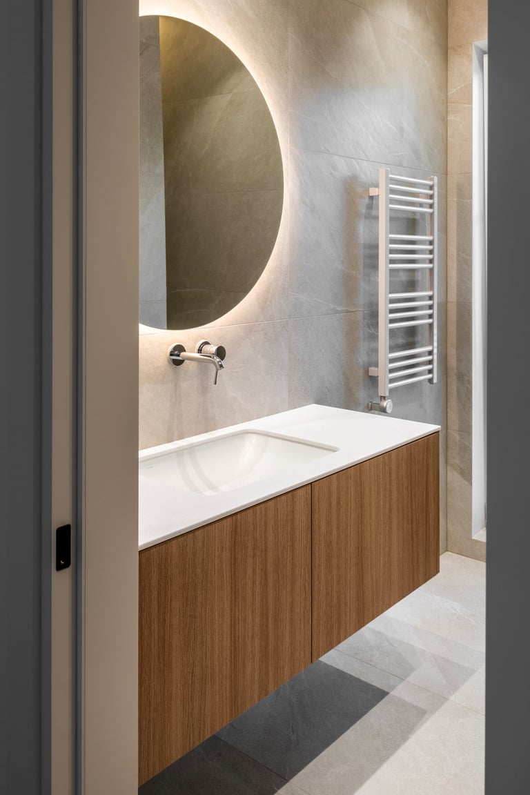 Namai, kuriuose minimalistinę visumą kuriančios formos ir natūralūs atspalviai susilieja į ramią kasdienybę. Medžio ir akmens tekstūros sušildo šviesią pastelinę aplinkos paletę. Išraiškingas architektūrinis akcentas – dvi arkos, formuojančios subtilius perėjimus tarp svetainės ir virtuvės zonų. Interjeras alsuoja skandinavišku lengvumu ir vientisumu.