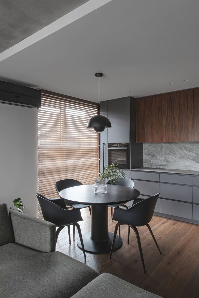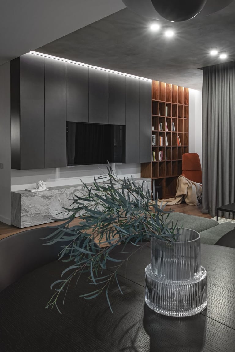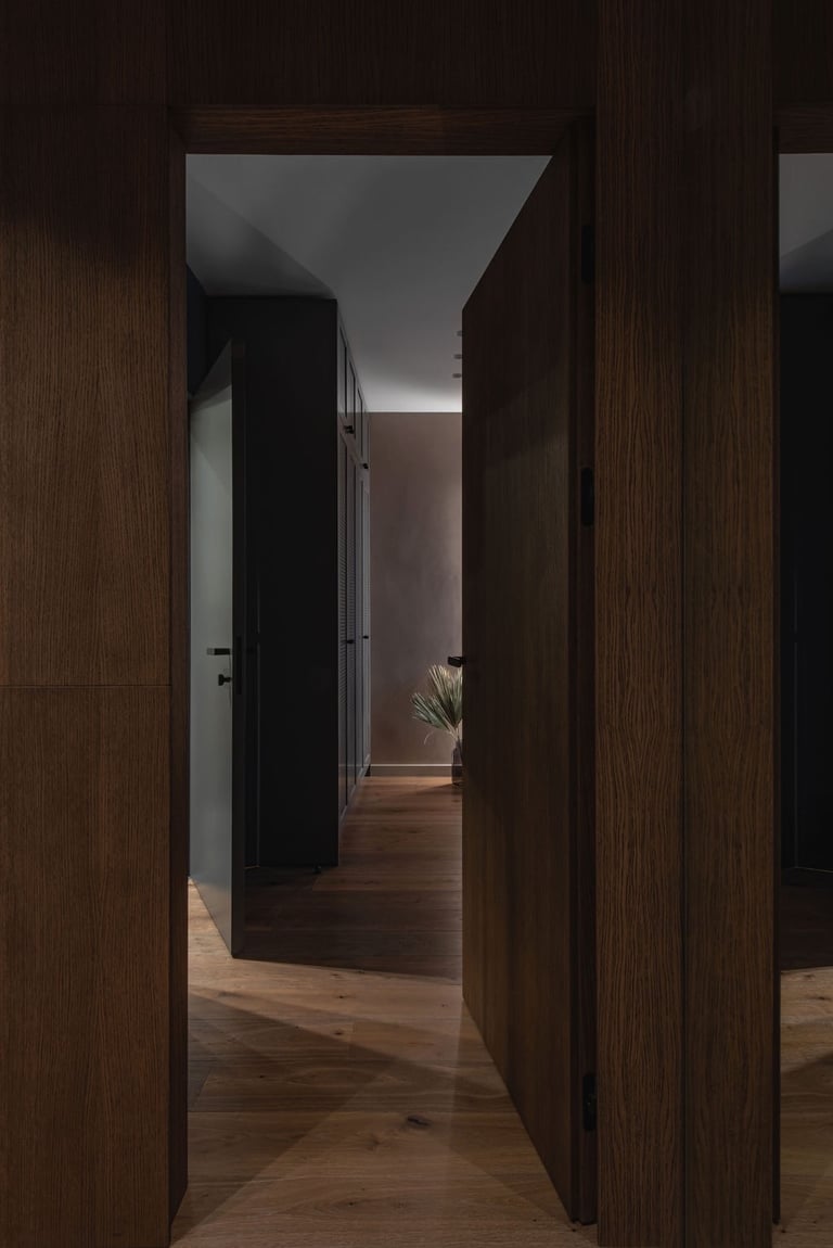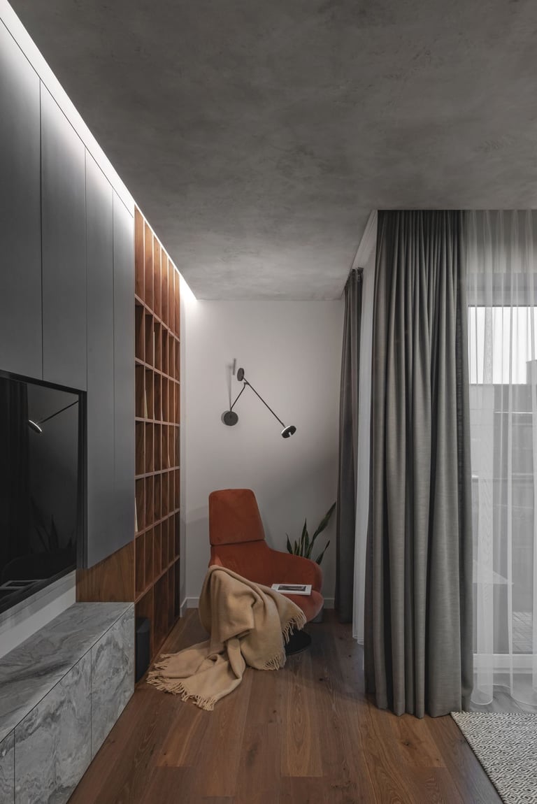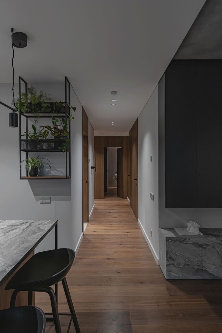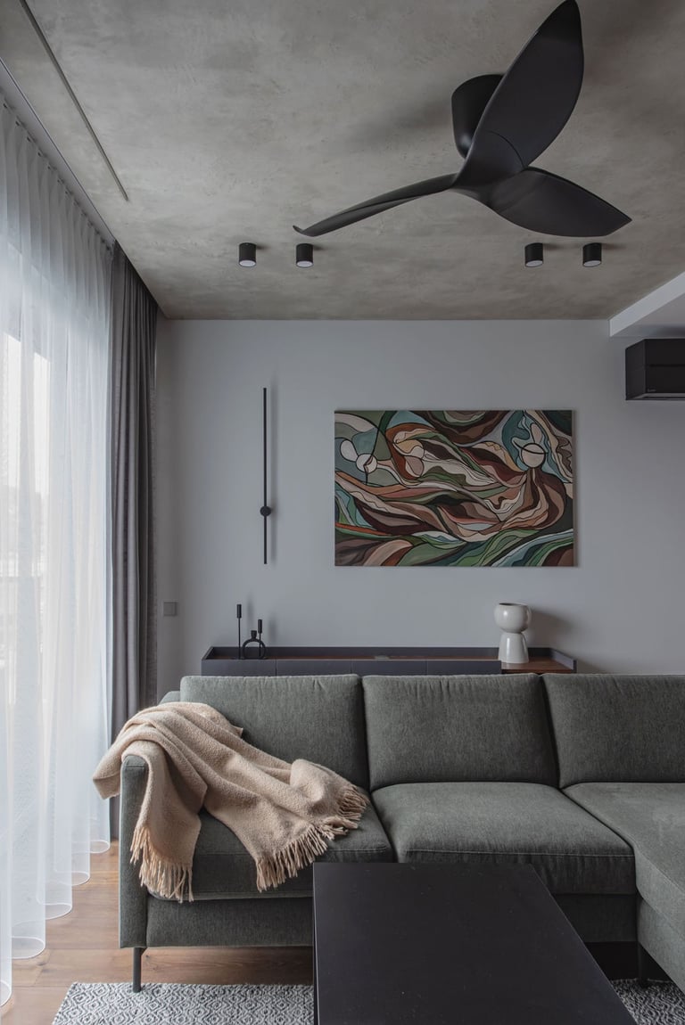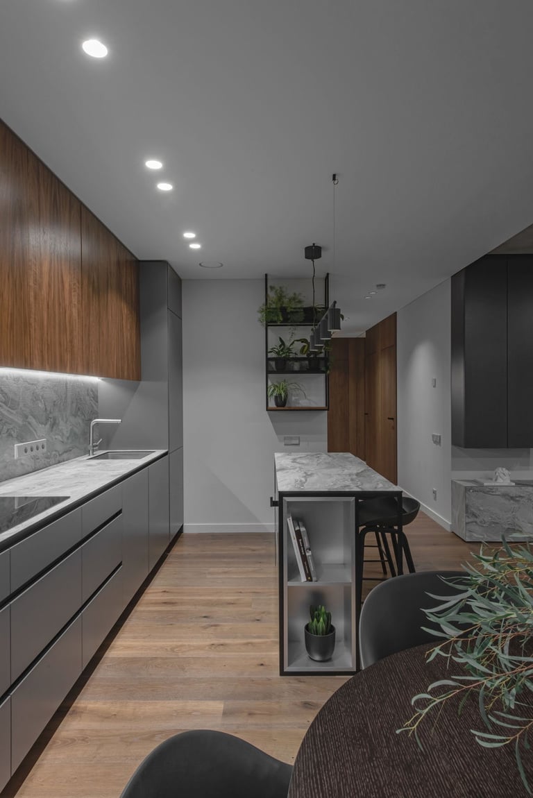 Tamsūs ir šilti tonai kuria pagrindinę šio keturių kambarių buto emociją. Pilkų atspalvių fone subtiliai atkartojamos žemiško kolorito spalvos, natūralaus medžio motyvai, molio tinko apdaila.