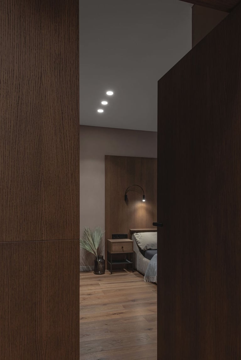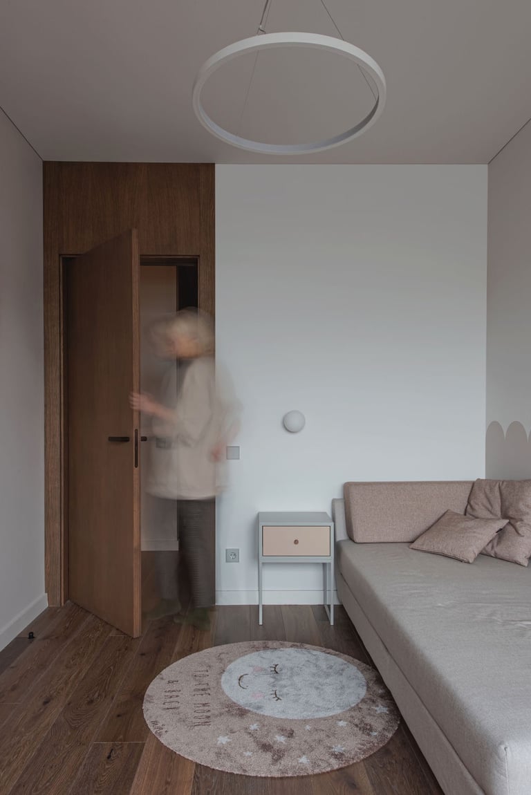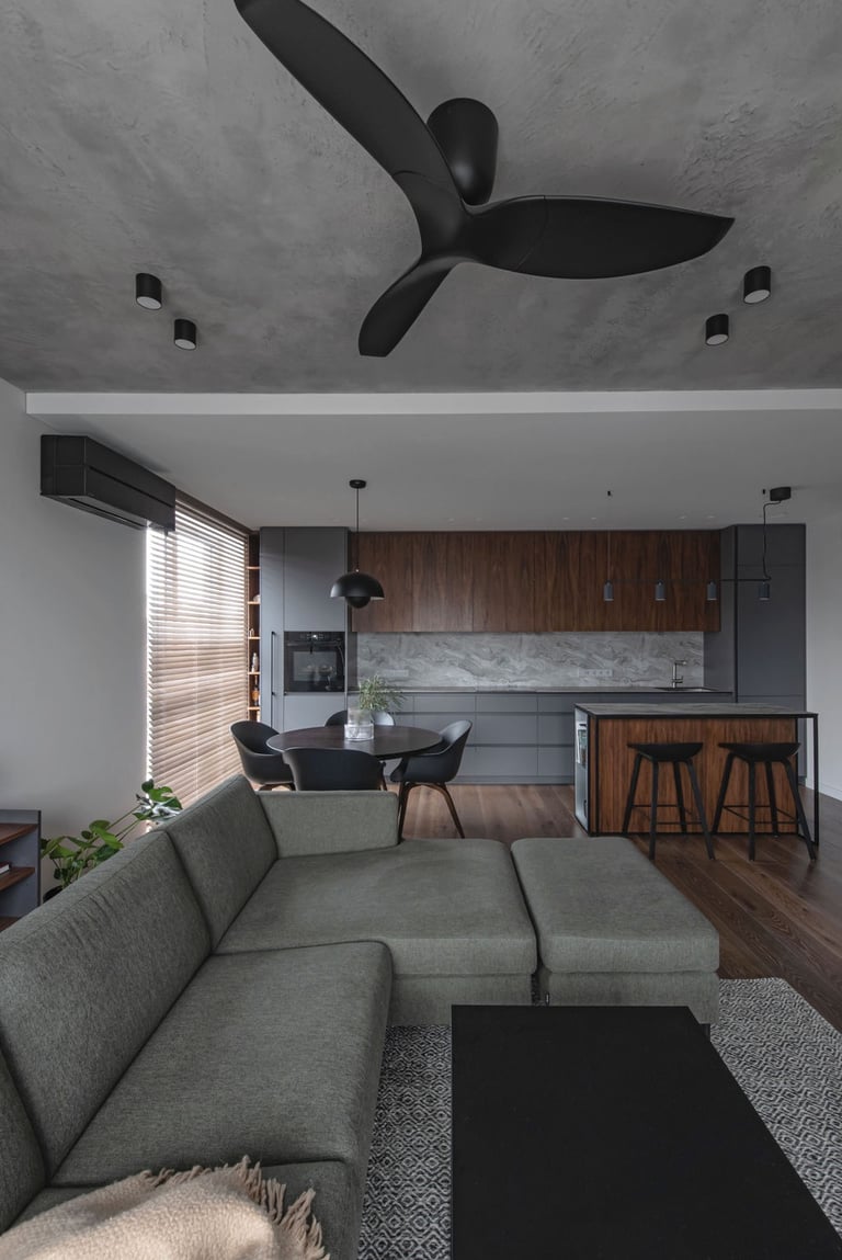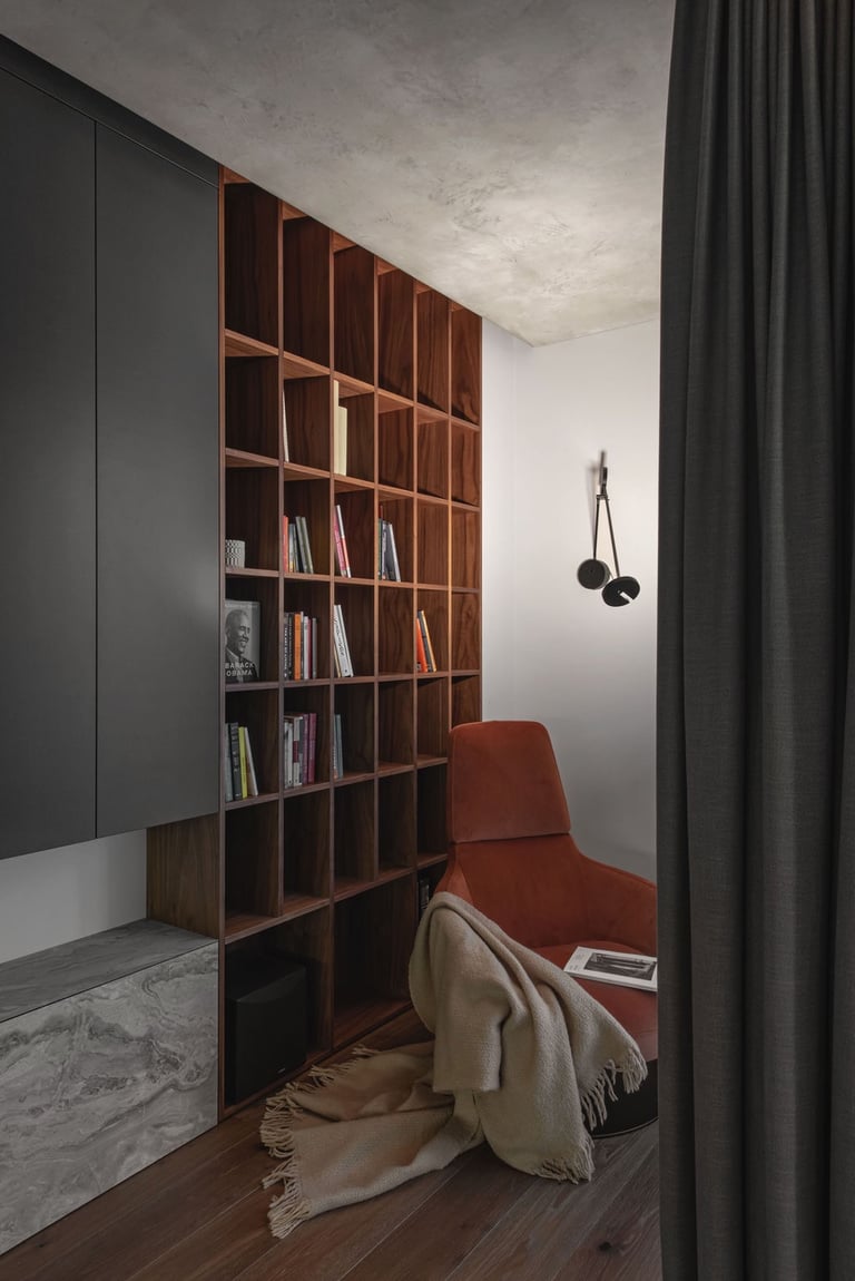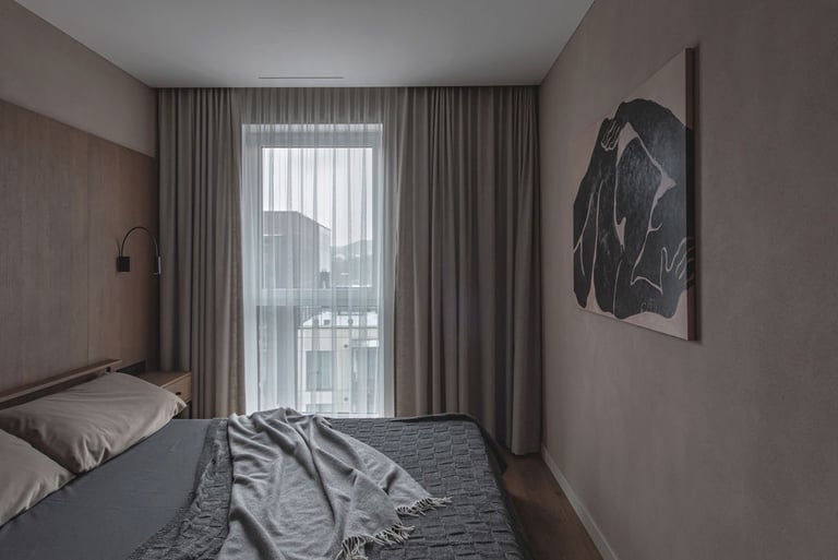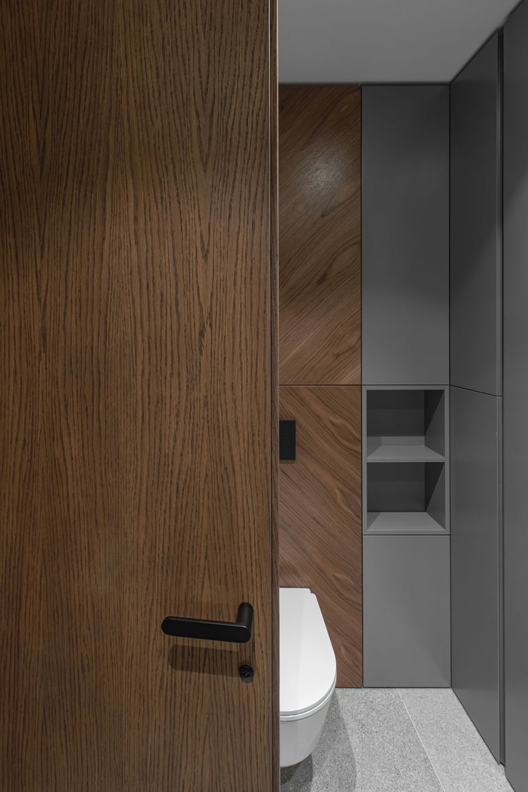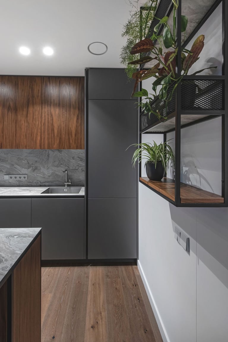Tamsūs ir šilti tonai kuria pagrindinę šio keturių kambarių buto emociją. Pilkų atspalvių fone subtiliai atkartojamos žemiško kolorito spalvos, natūralaus medžio motyvai, molio tinko apdaila.