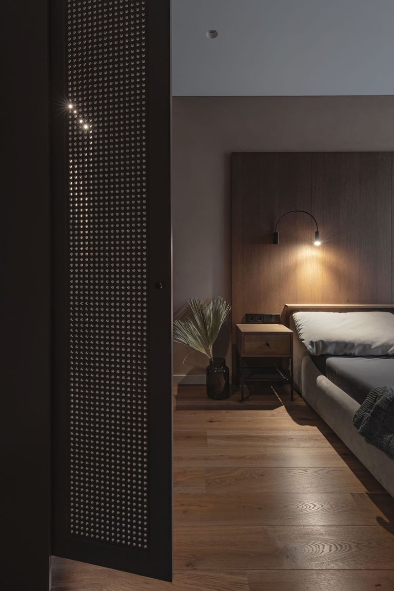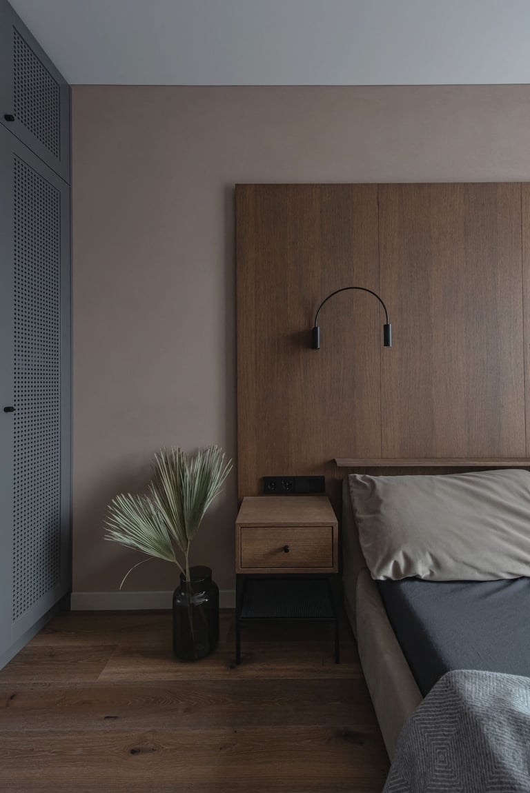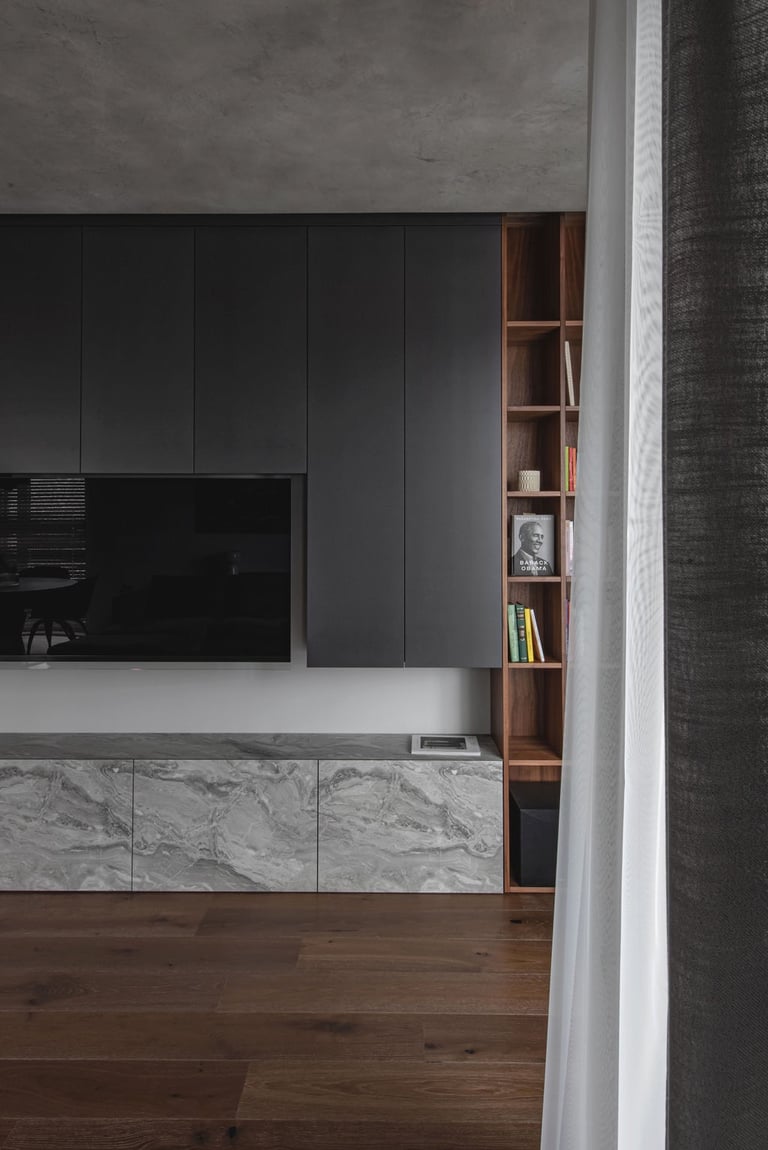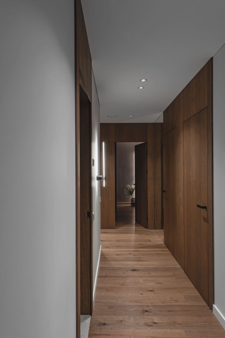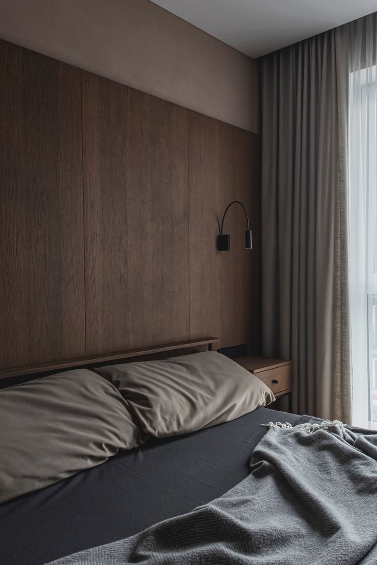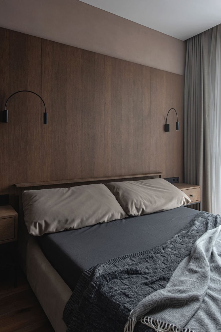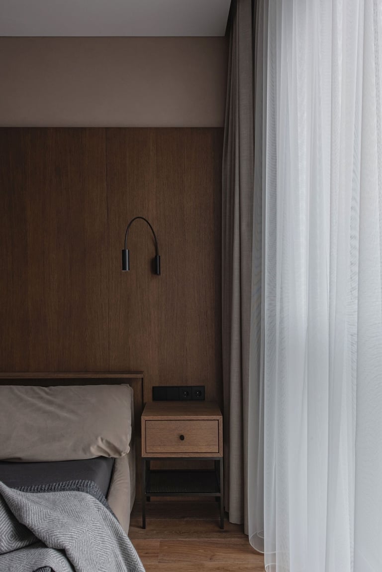 Tamsūs ir šilti tonai kuria pagrindinę šio keturių kambarių buto emociją. Pilkų atspalvių fone subtiliai atkartojamos žemiško kolorito spalvos, natūralaus medžio motyvai, molio tinko apdaila.