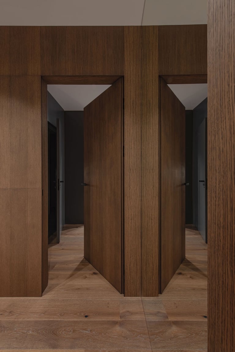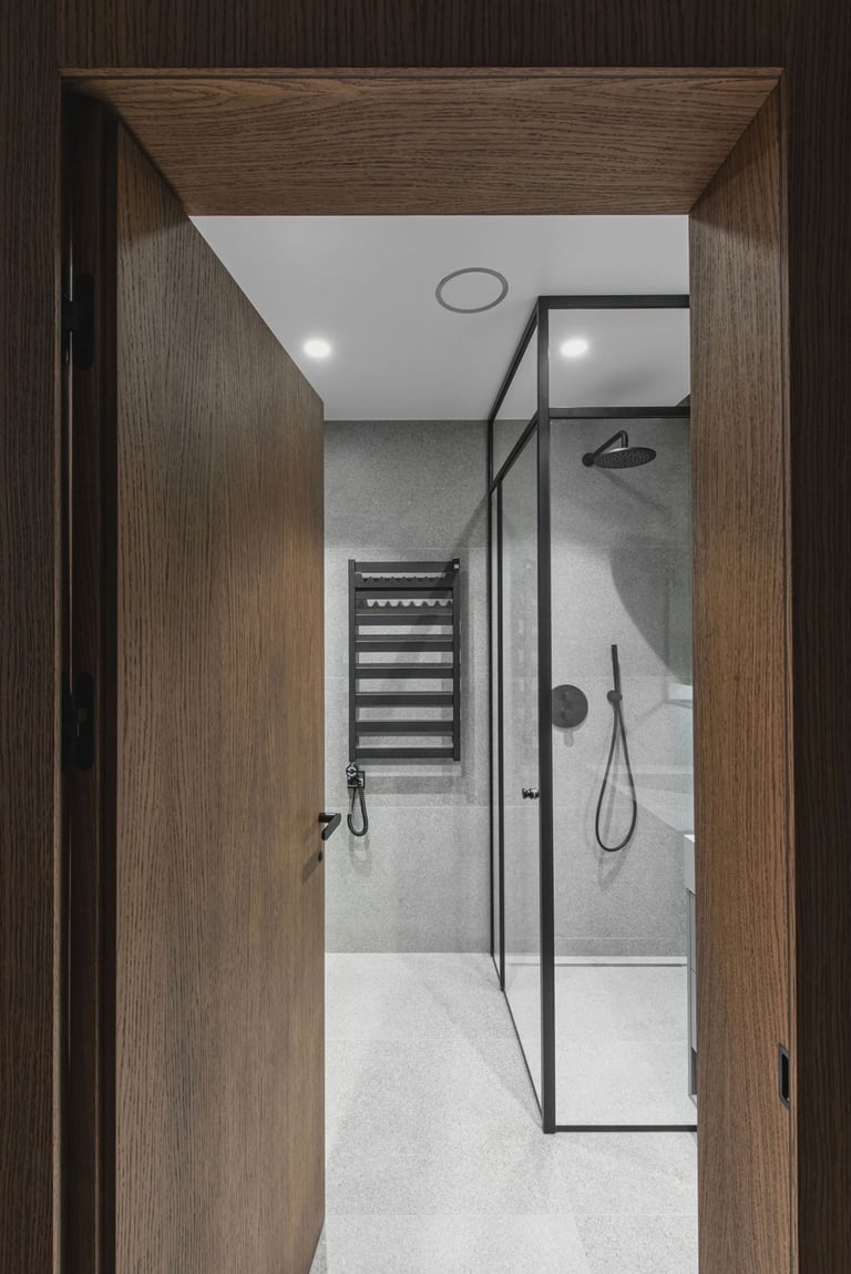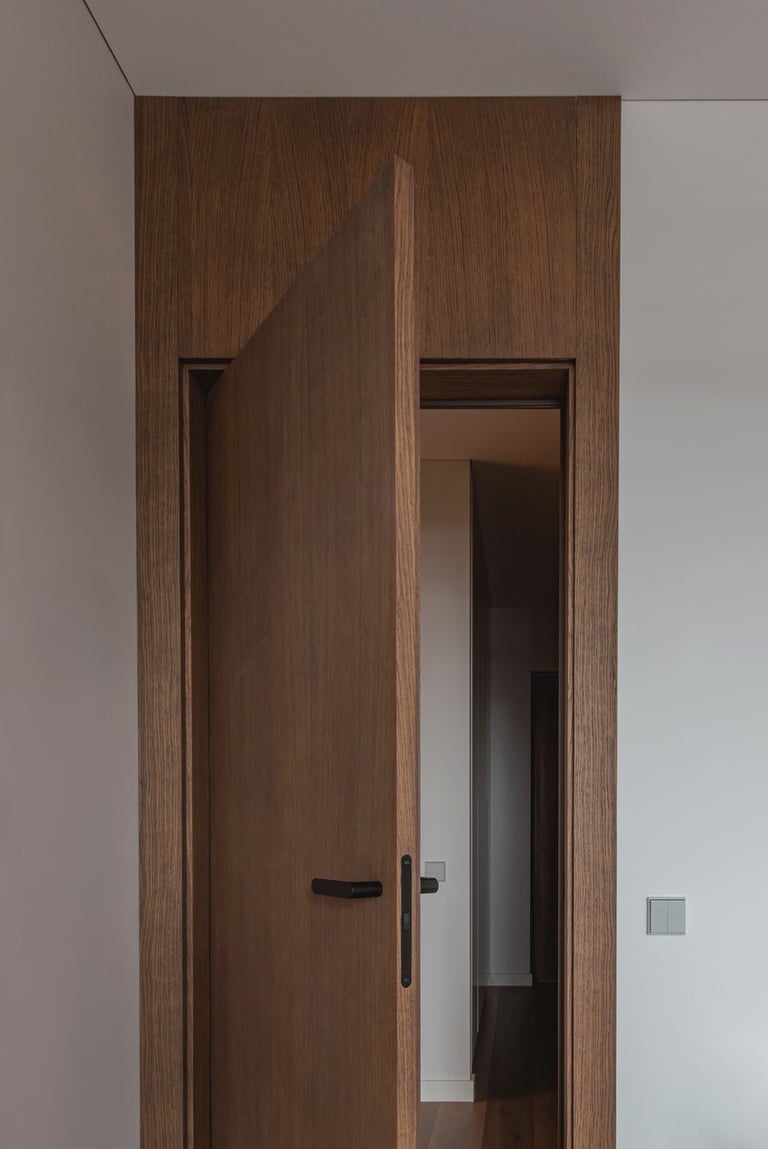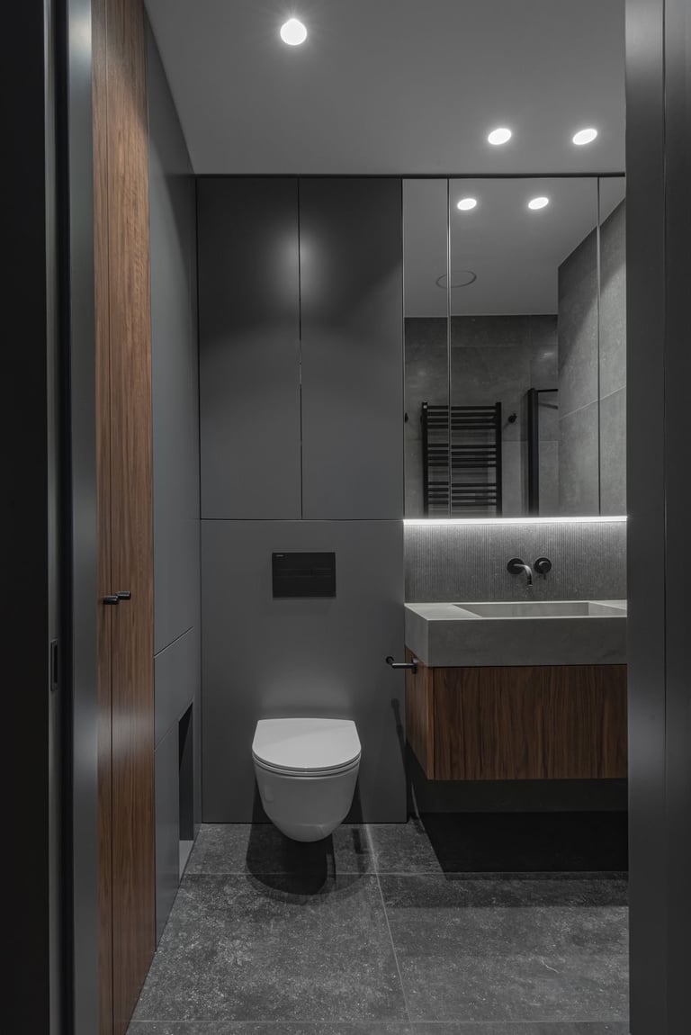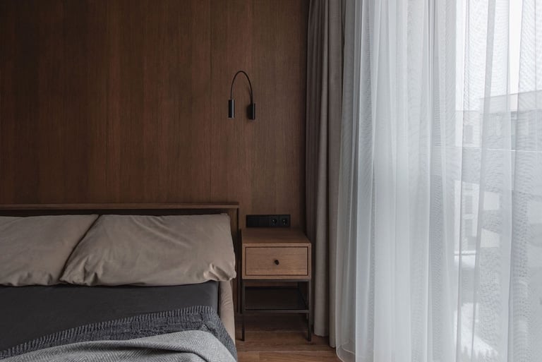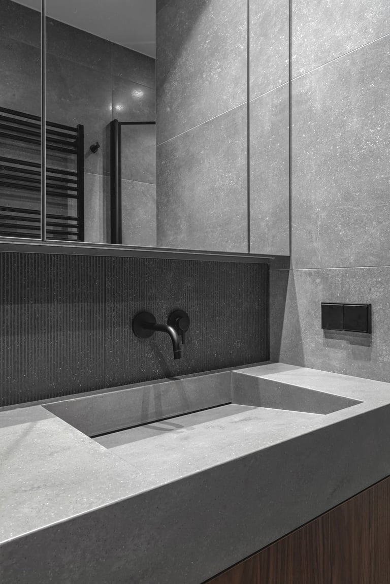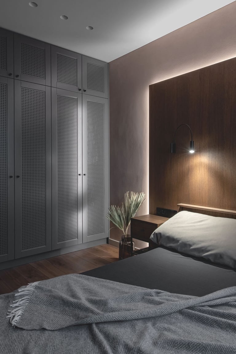 Tamsūs ir šilti tonai kuria pagrindinę šio keturių kambarių buto emociją. Pilkų atspalvių fone subtiliai atkartojamos žemiško kolorito spalvos, natūralaus medžio motyvai, molio tinko apdaila.