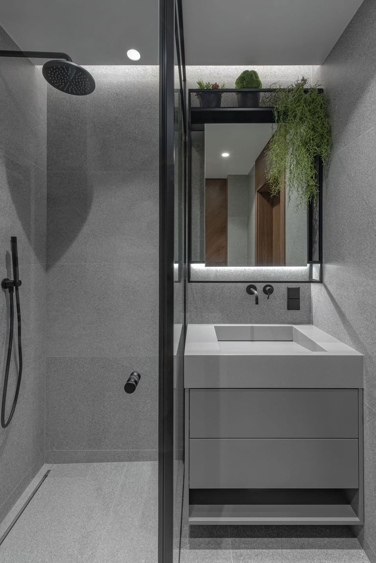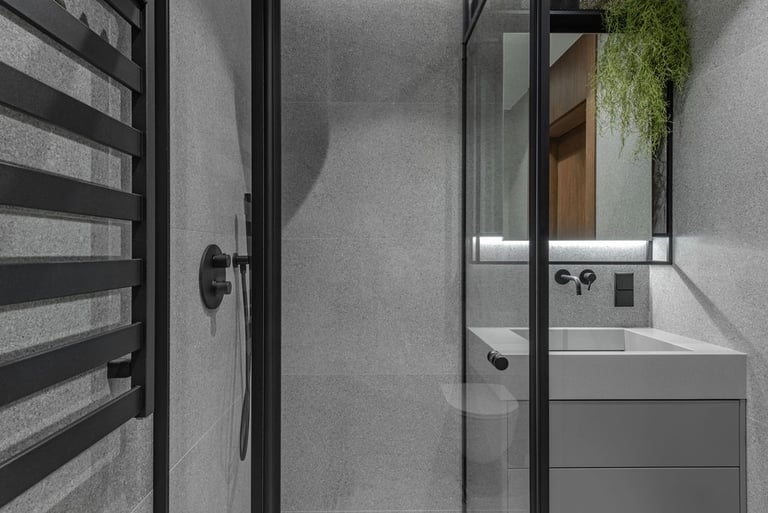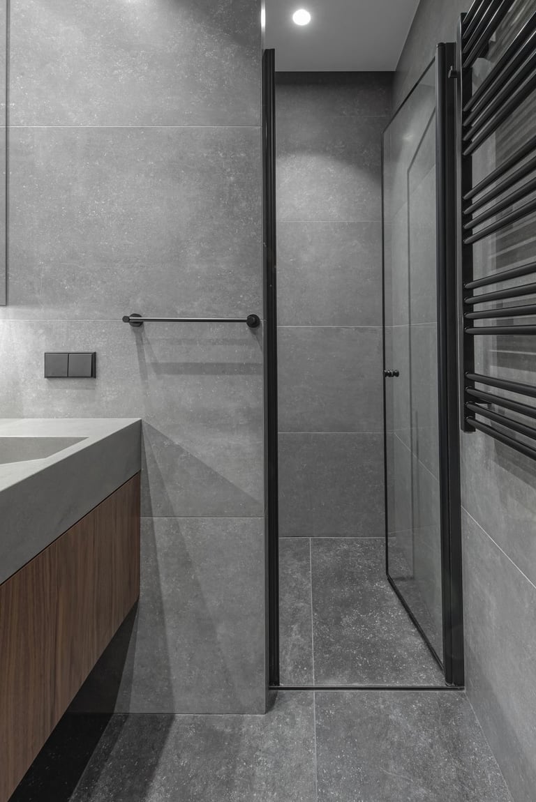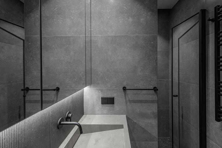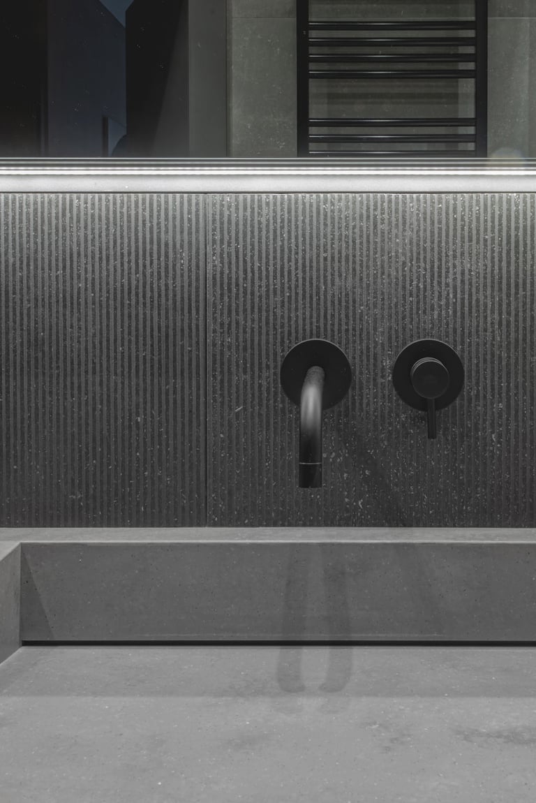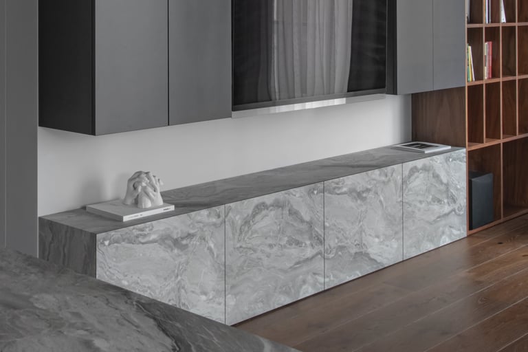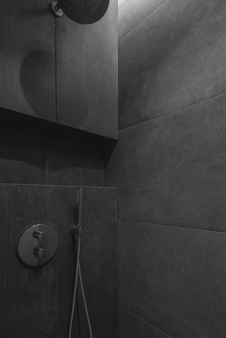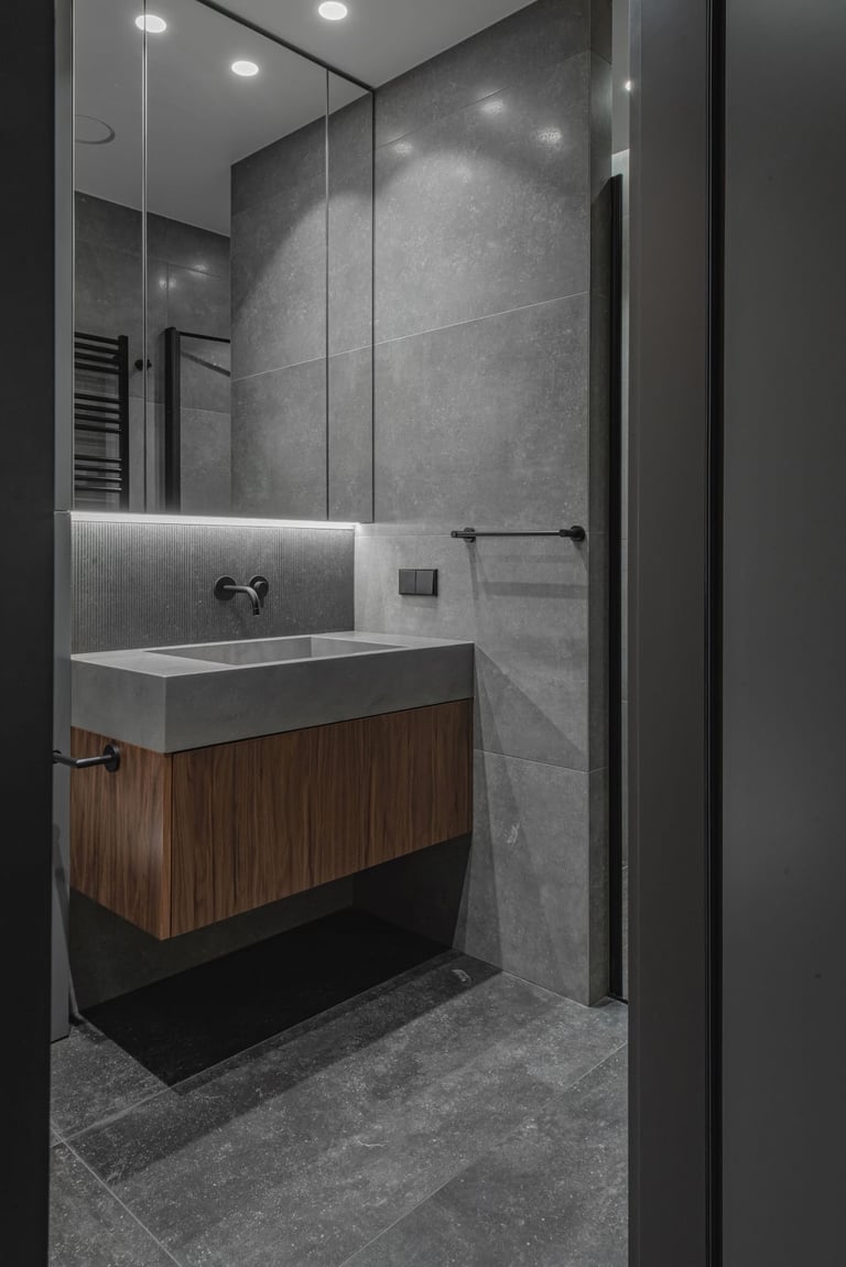 Tamsūs ir šilti tonai kuria pagrindinę šio keturių kambarių buto emociją. Pilkų atspalvių fone subtiliai atkartojamos žemiško kolorito spalvos, natūralaus medžio motyvai, molio tinko apdaila.