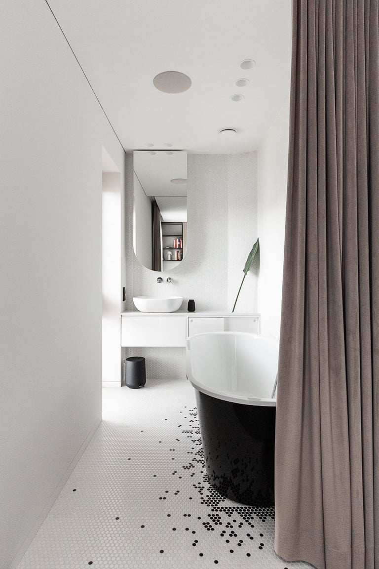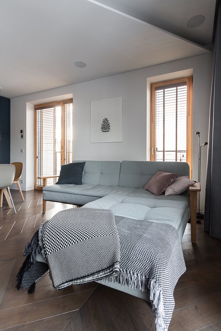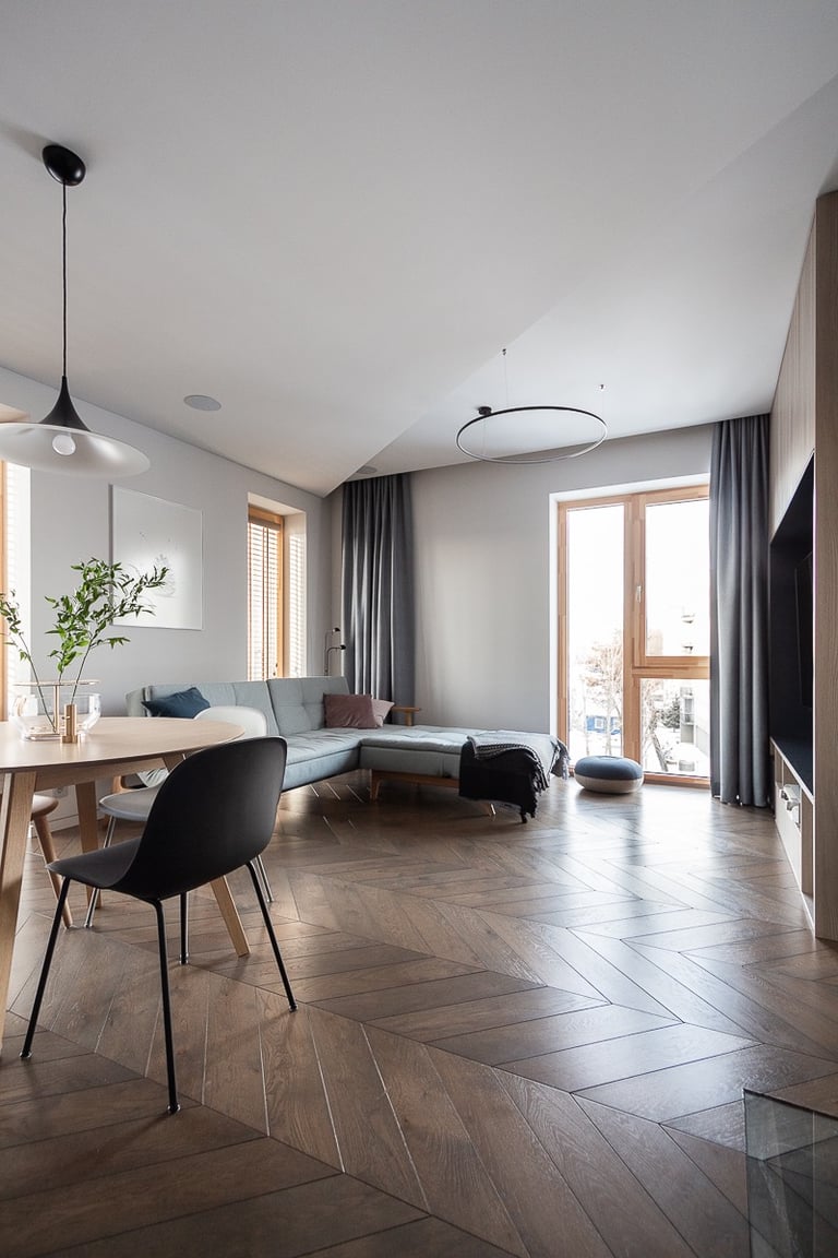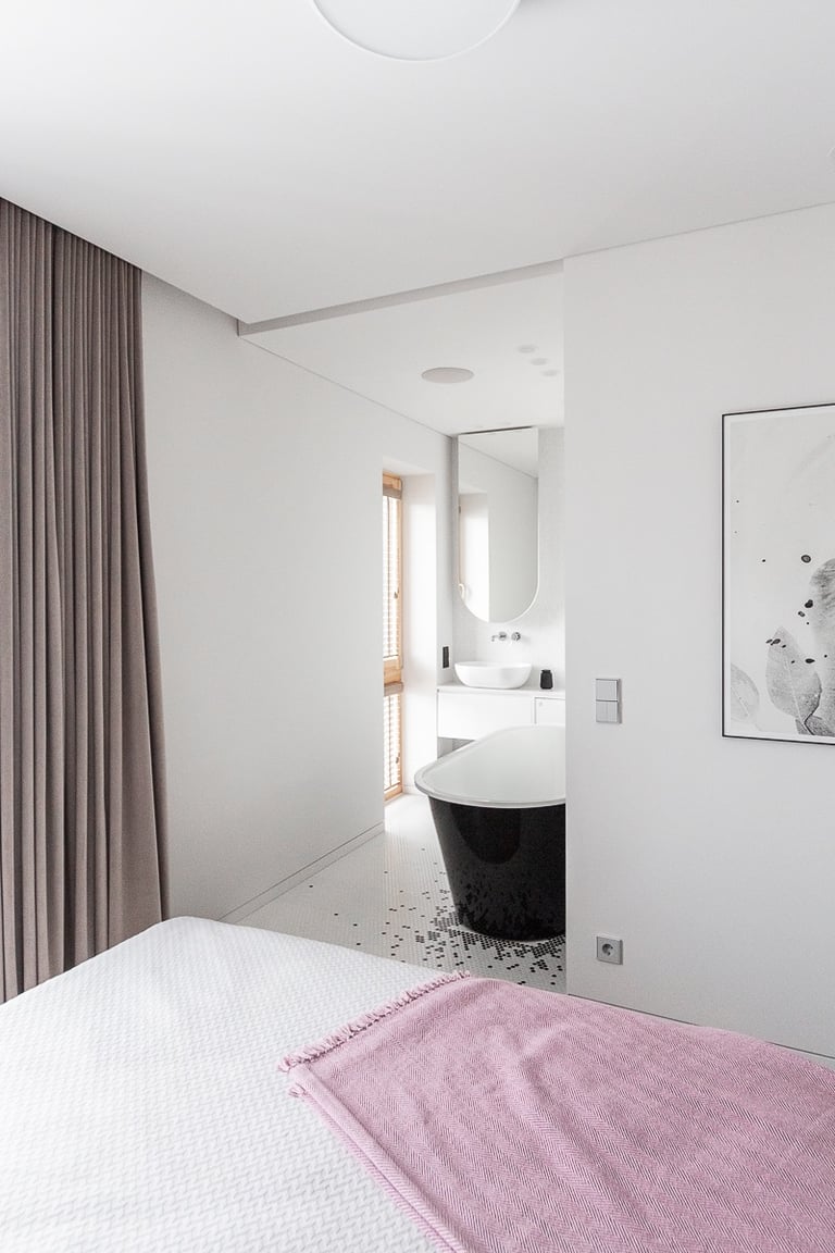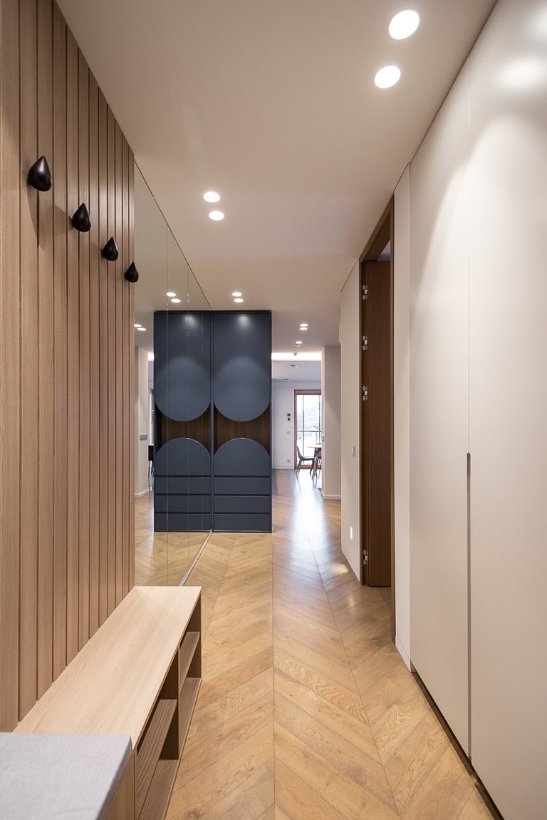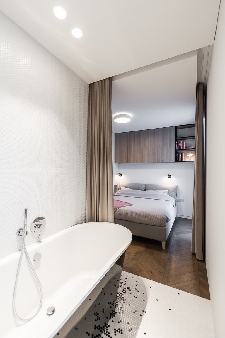 Pagrindinės erdvės plečiamos atkartojant laužytas namo linijas. Miegamojo zona sujungiama su vonios kambariu, taip stiprinant erdvės ir šviesos pojūtį. Butas kurtas jaunai šeimai, ieškančiai racionalių ir modernių sprendimų.
