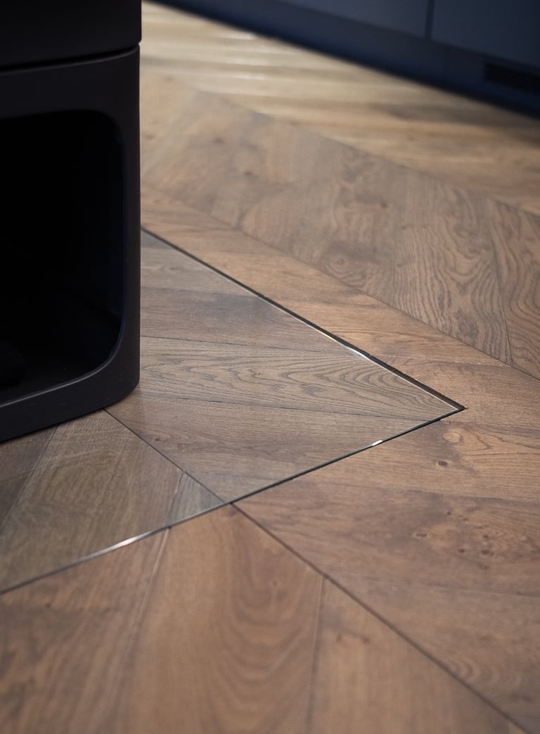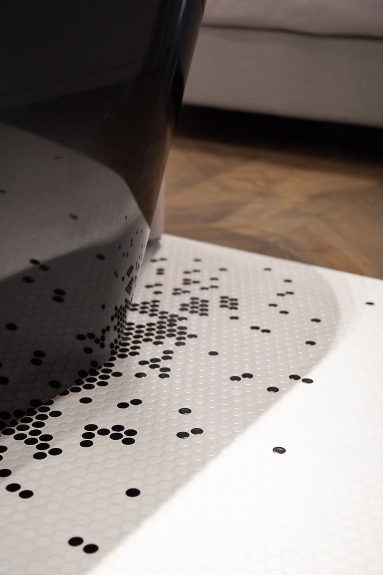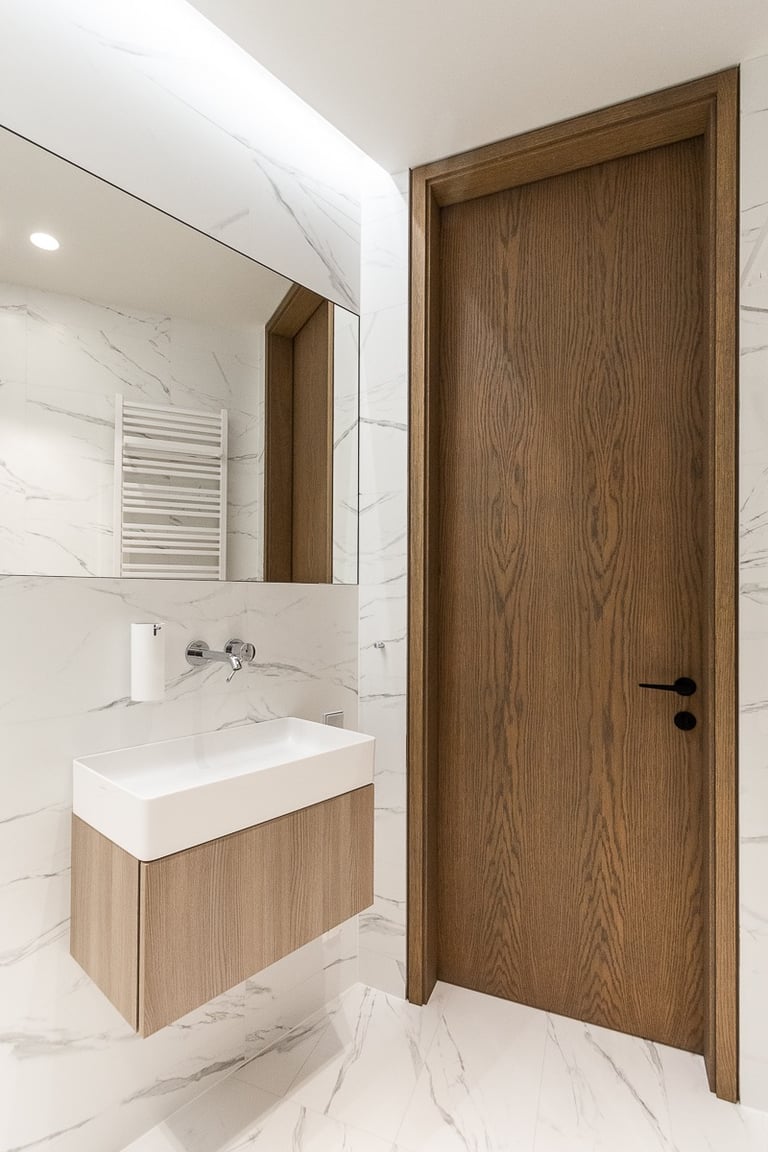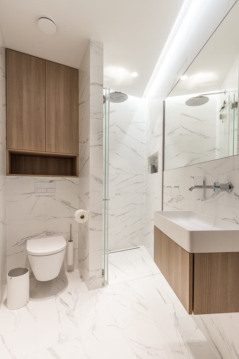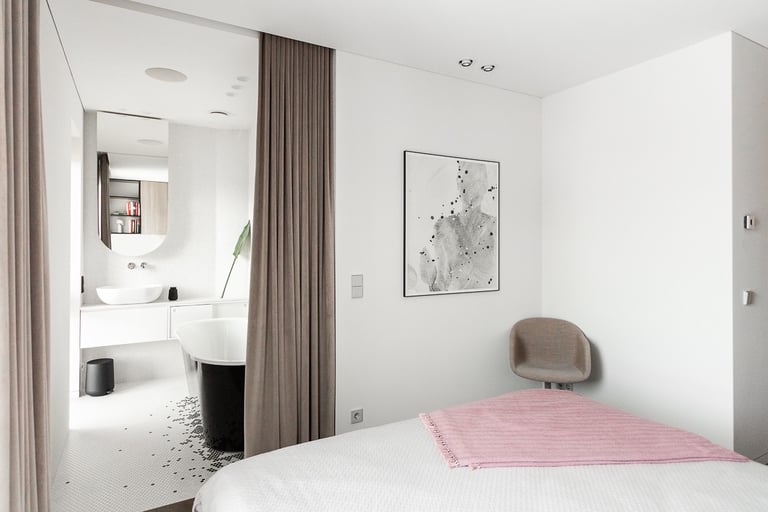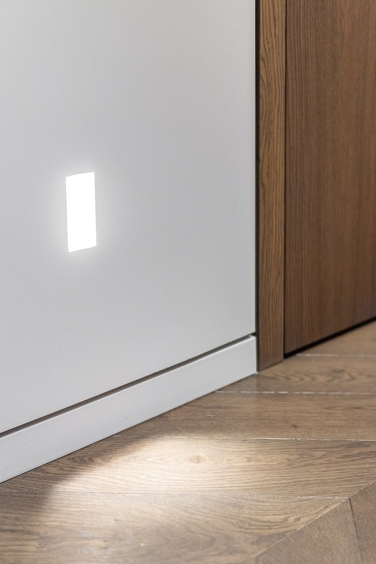 Pagrindinės erdvės plečiamos atkartojant laužytas namo linijas. Miegamojo zona sujungiama su vonios kambariu, taip stiprinant erdvės ir šviesos pojūtį. Butas kurtas jaunai šeimai, ieškančiai racionalių ir modernių sprendimų.