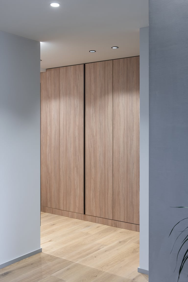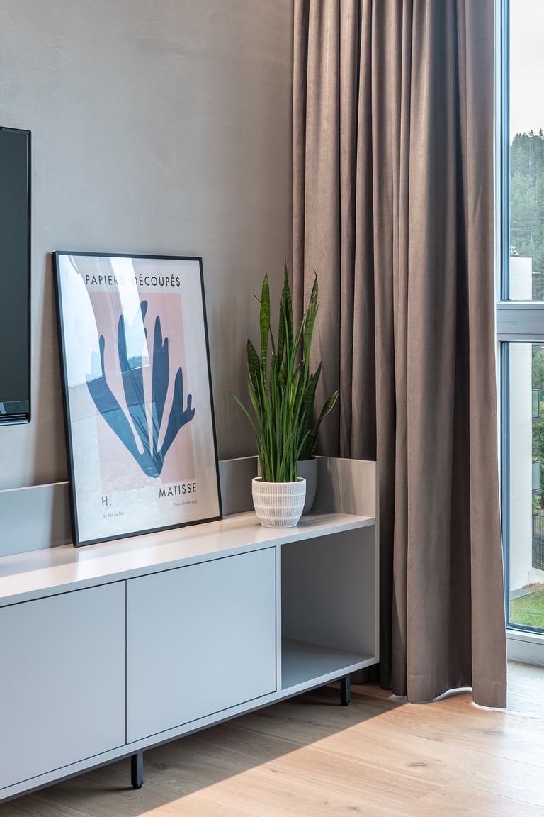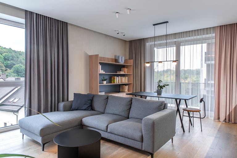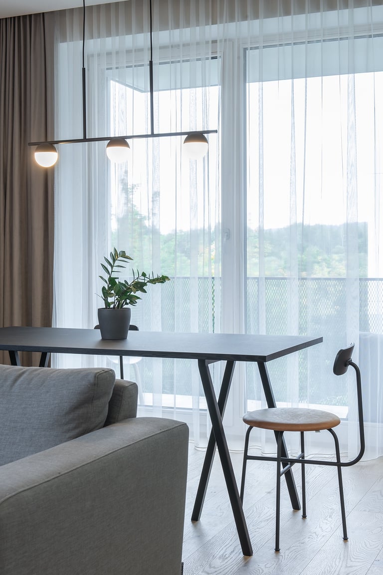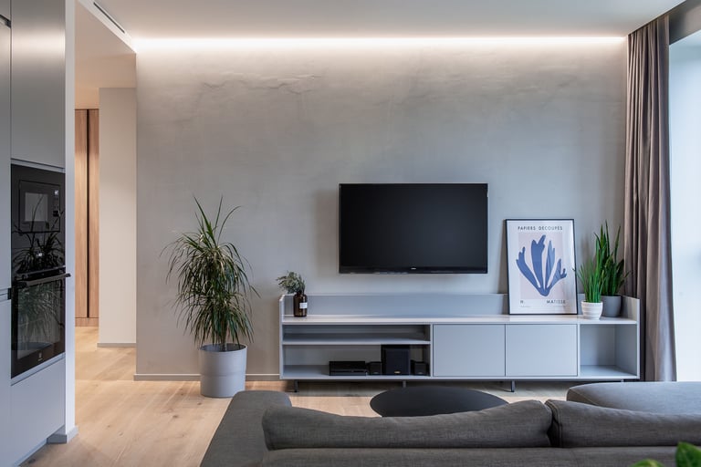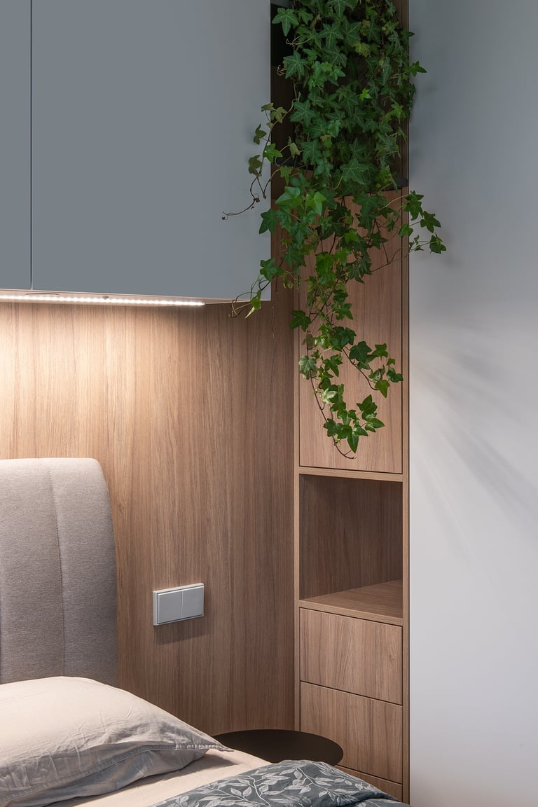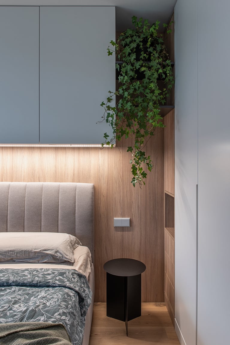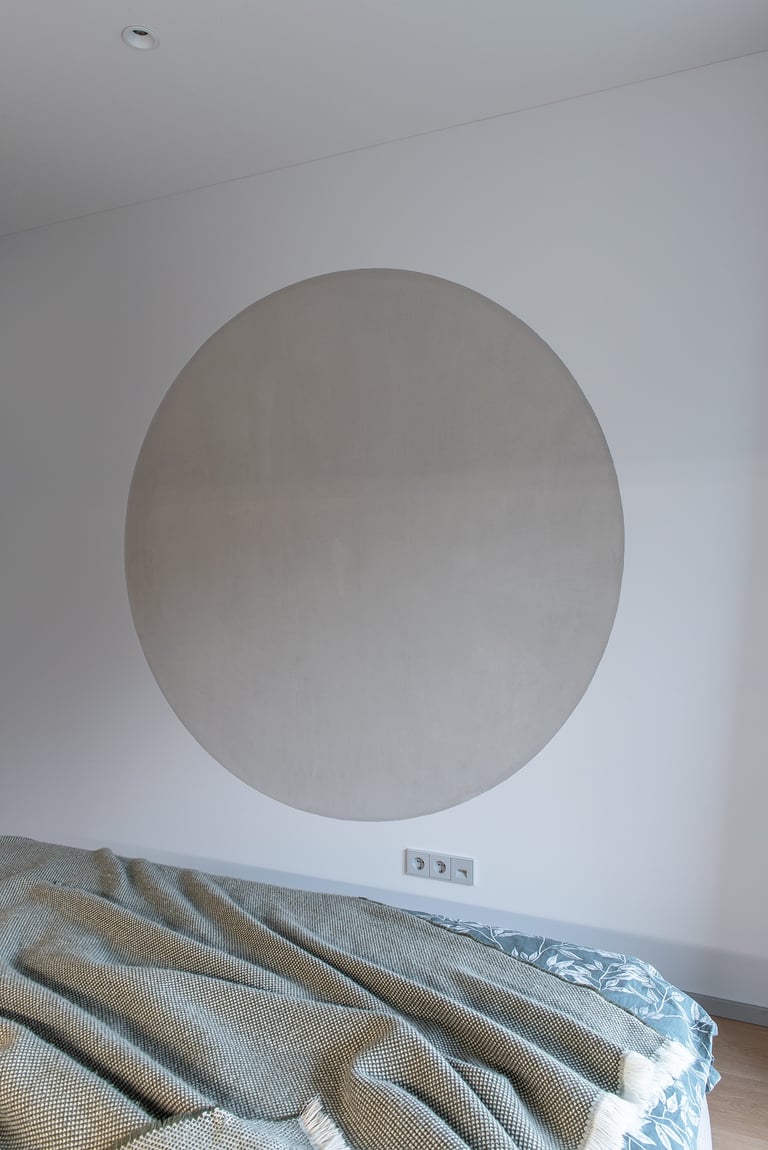 Ramiame jaunos šeimos namų interjere dominuoja šiltos spalvos, kontrastai ir geometrinių formų žaismas. Naudojama daug medžio, skirtingų spalvų tekstilės, sienos dekoruojamos tinku.